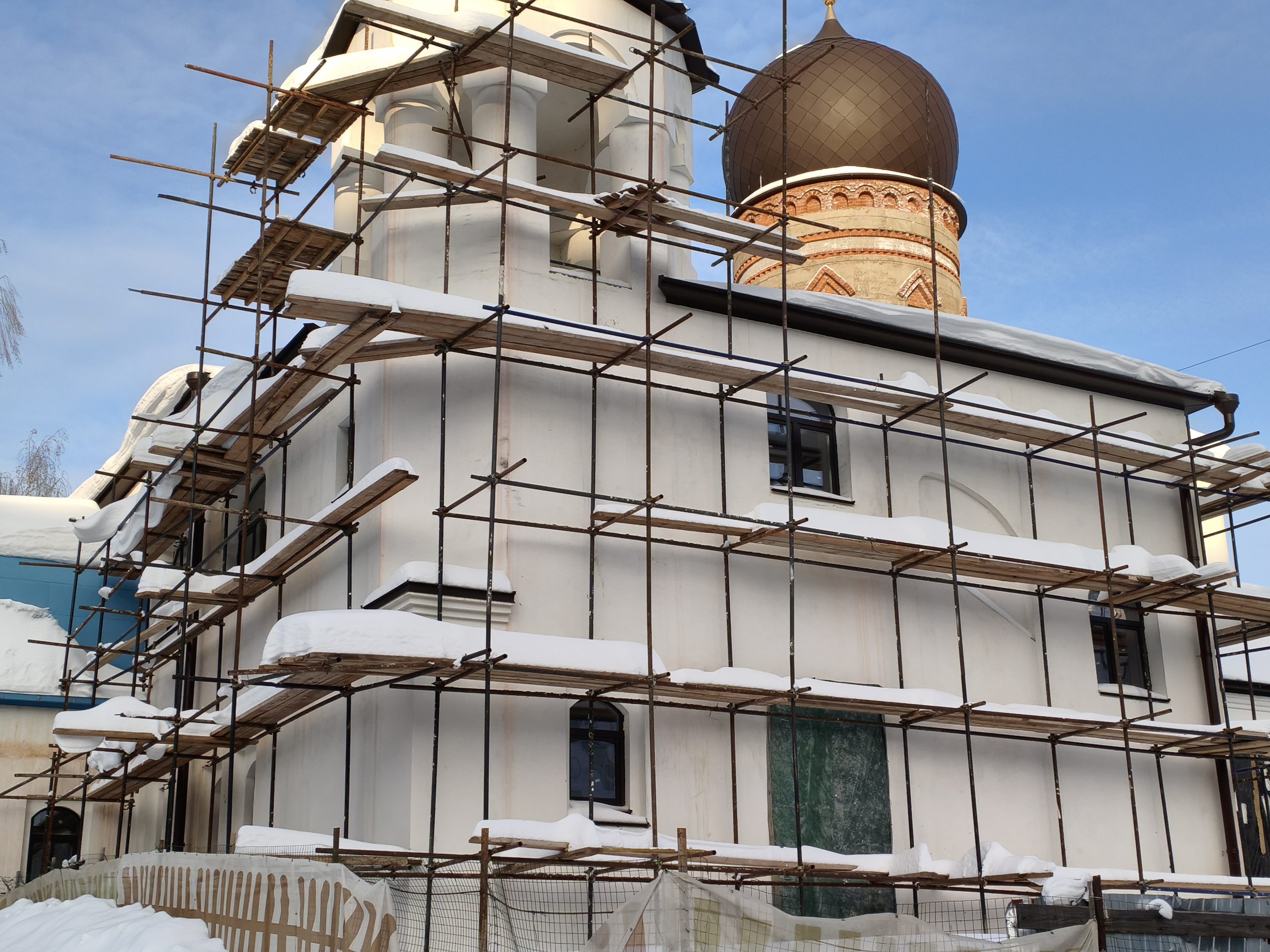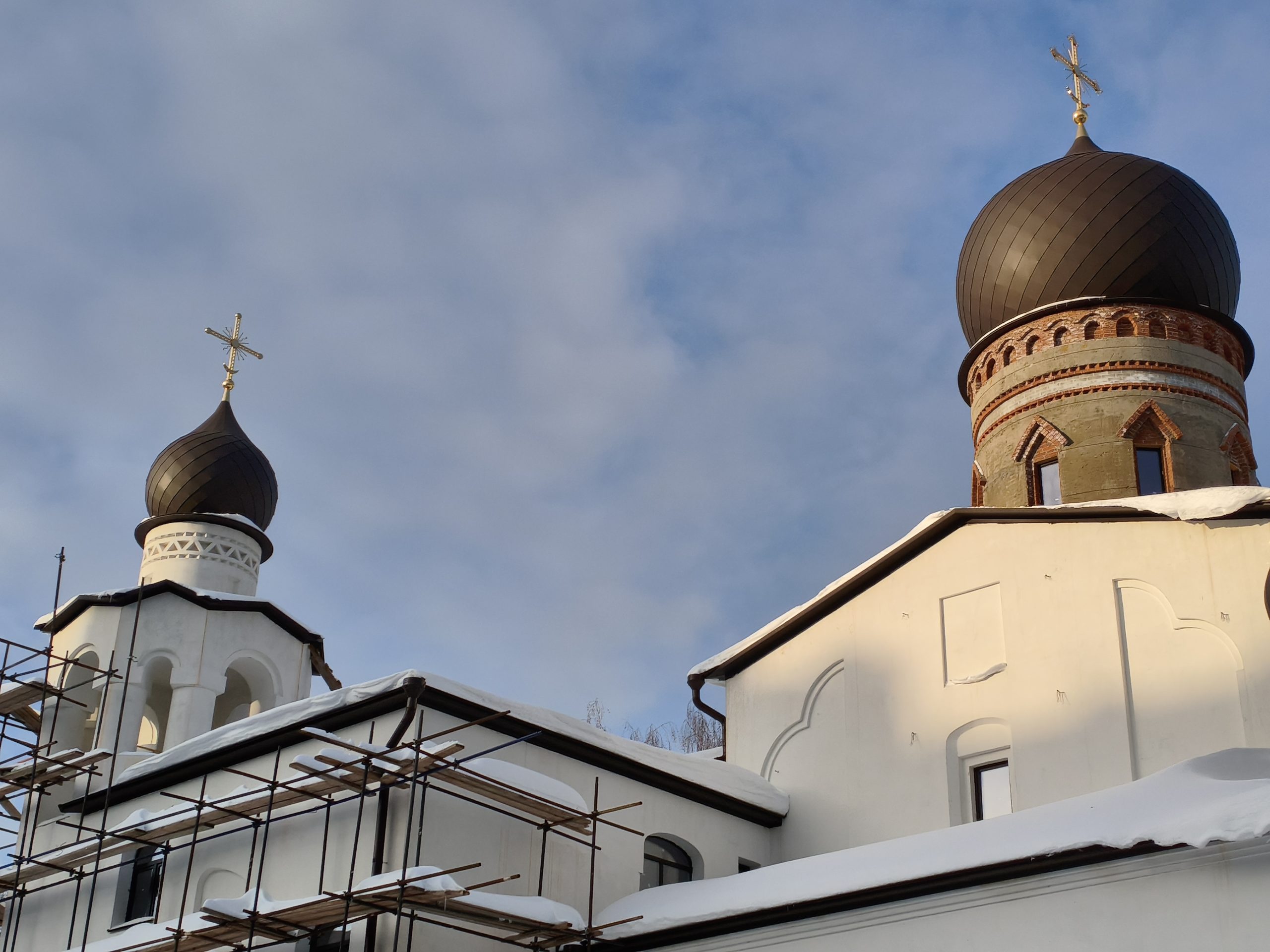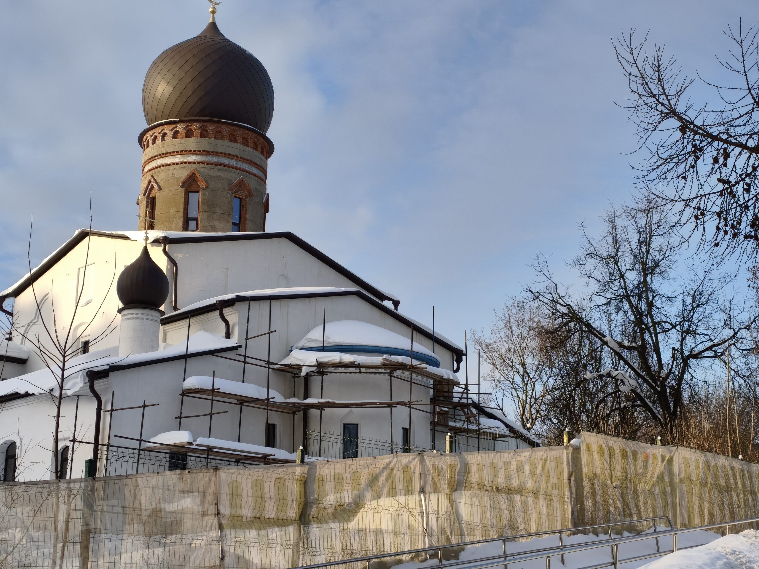 Продолжается строительство второй части храма в честь иконы Божией Матери «Нечаянная радость» в районе Чертаново Северное. Напомним, что возведение церкви на Днепропетровской улице началось в 2017 году, а уже в апреле 2019 года здесь отслужили первую Божественную Литургию. На сегодняшний день, 12 февраля, ведутся работы по отделке фасадной части будущего здания храма, на башни установлены купола.